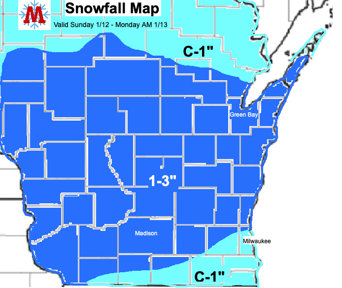 On the heels of Saturday’s bust of a snowstorm (we’ll refer to it as Winter Storm Trubisky from now on), Central and Southern Wisconsin will receive a consolation prize of sorts in the form of a light snow event tonight. Snow will begin tonight around 6pm in the western part of the state and gradually spread east through the evening, likely arriving in Madison between 7 and 8 pm. In general, 1-3 inches of new snow is expected for most of the area, including Madison and Green Bay. Areas to the southeast, including Milwaukee will likely see lower amounts in the range of a coating to an inch.